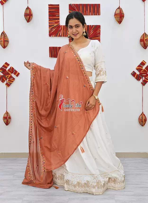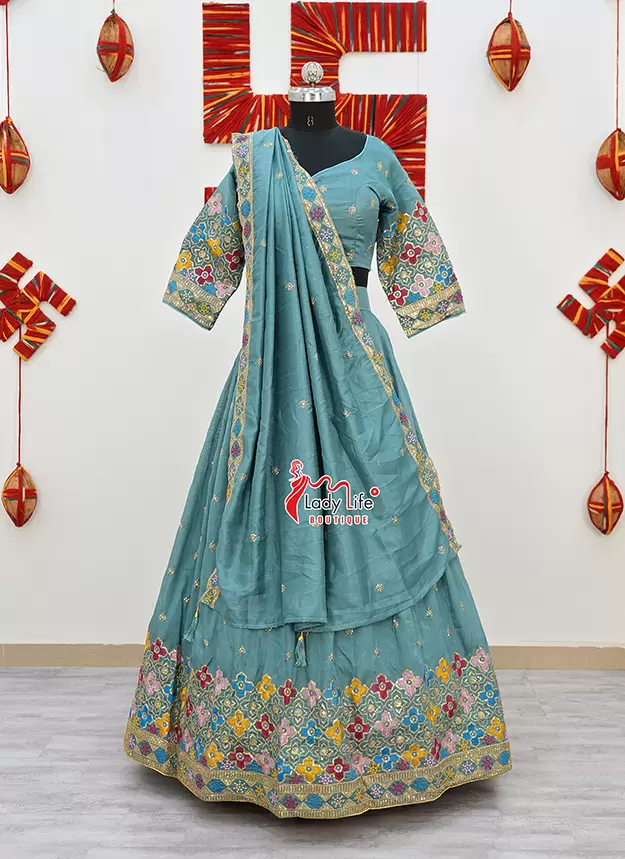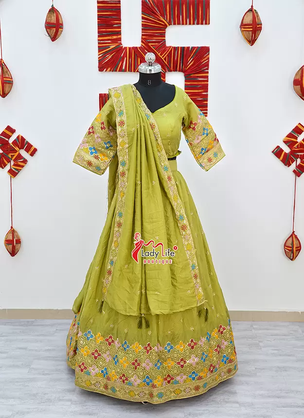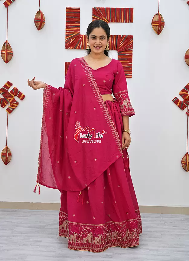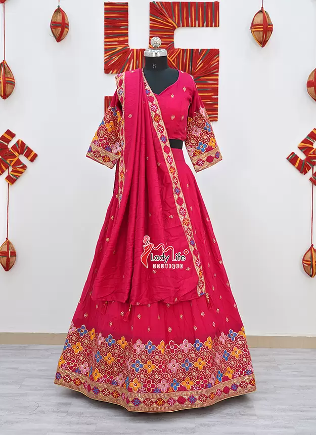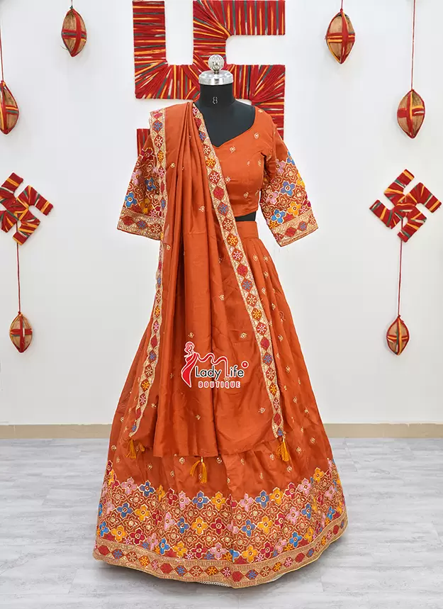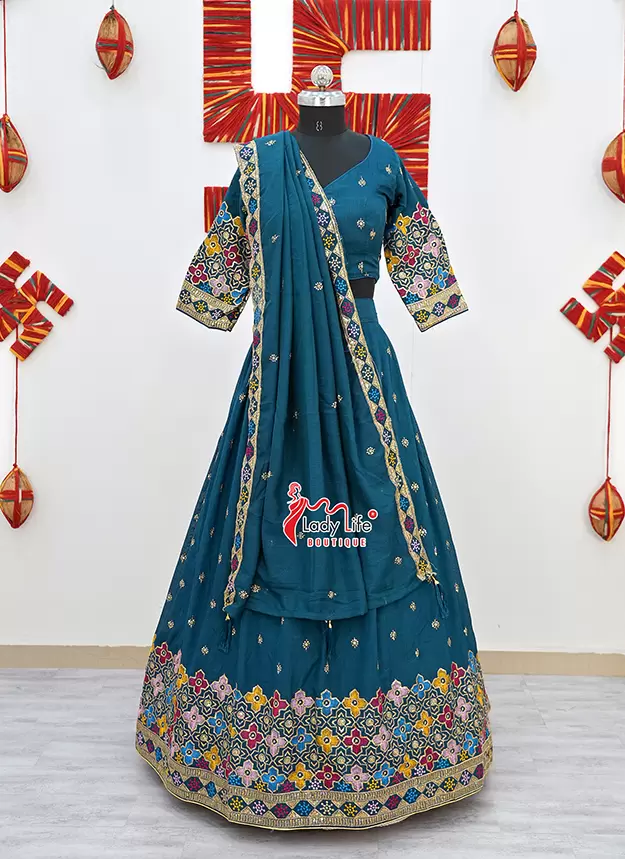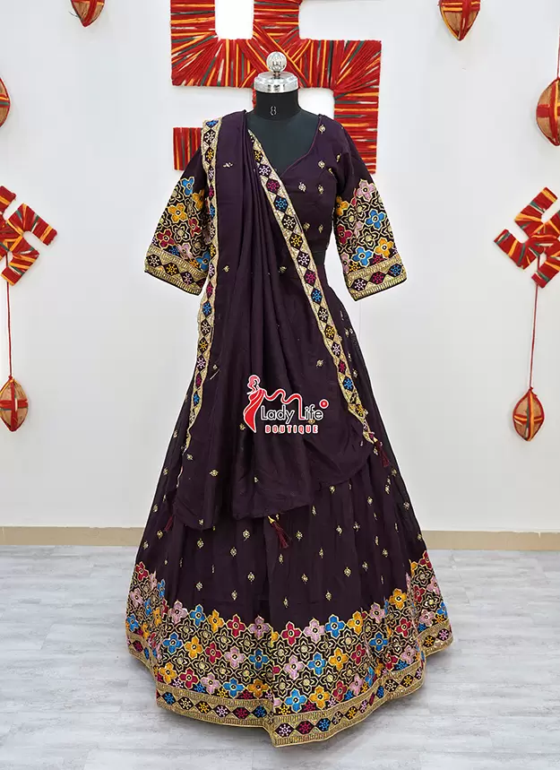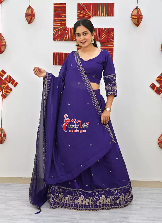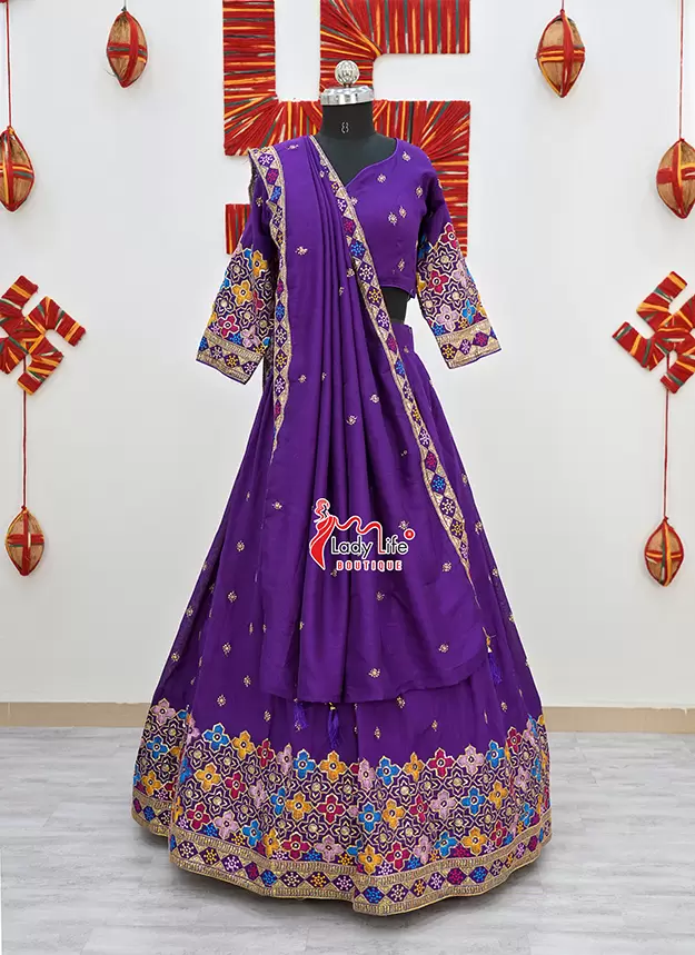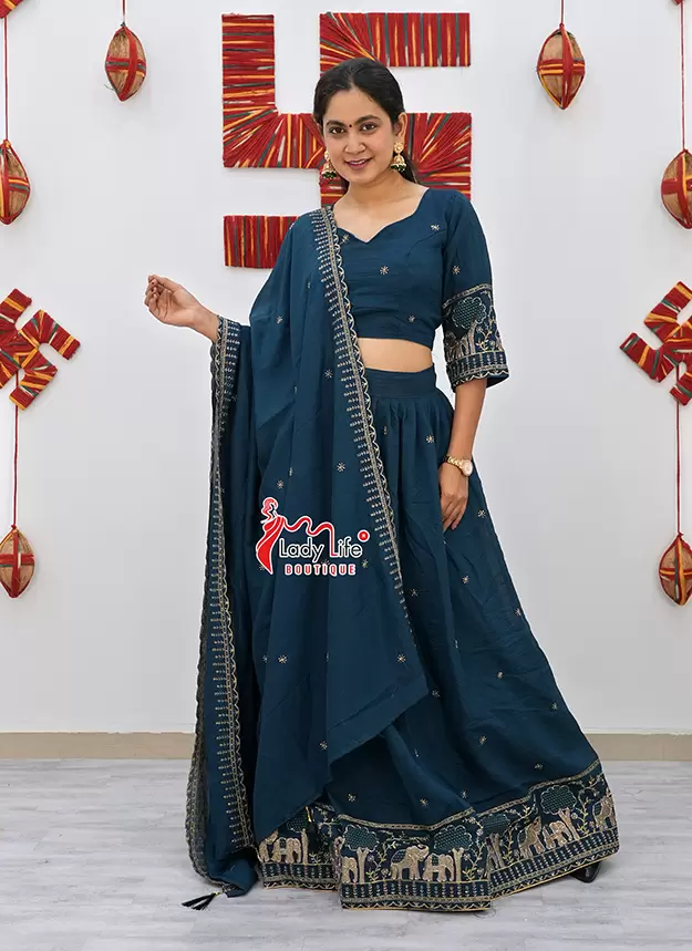 Chaniya Choli made from premium Vichitra fabric, featuring a beautiful 4-meter flair that gives a rich and graceful look. The lehenga comes with elegant woven border work and traditional motifs that enhance its ethnic charm. Paired with a stylish blouse and matching dupatta with delicate detailing, this outfit is perfect for festive occasions, weddings, and traditional celebrations. Comfortable to wear and designed to give a royal appearance. ✨