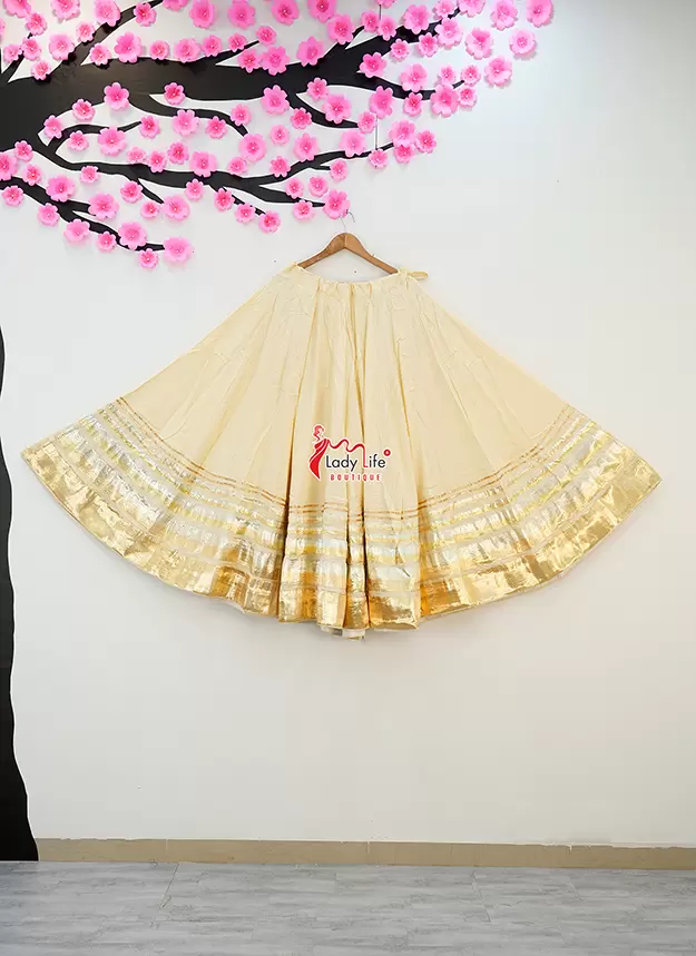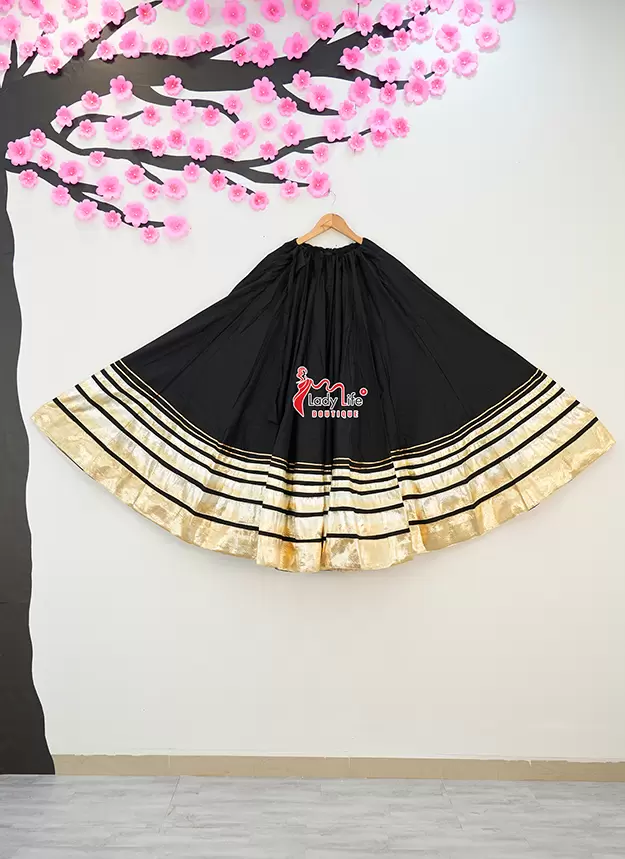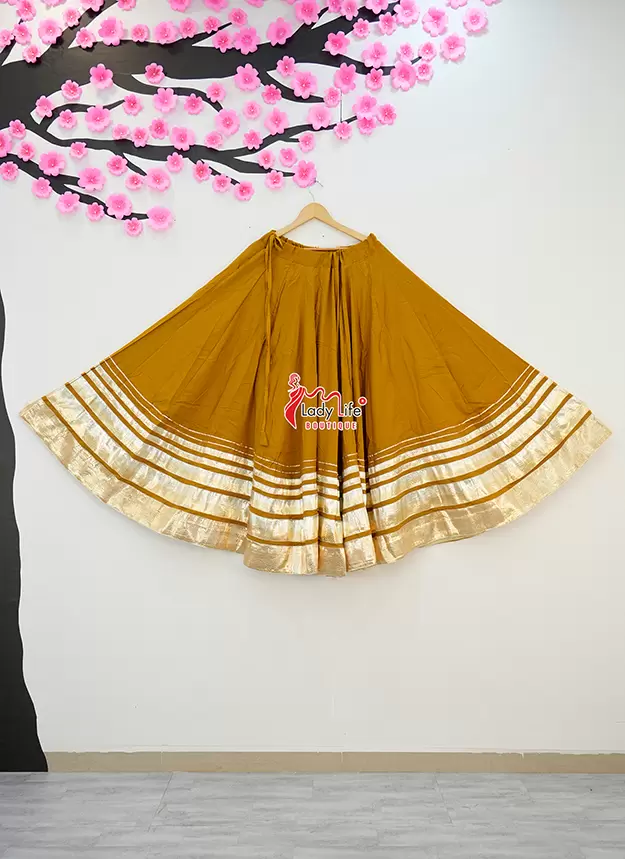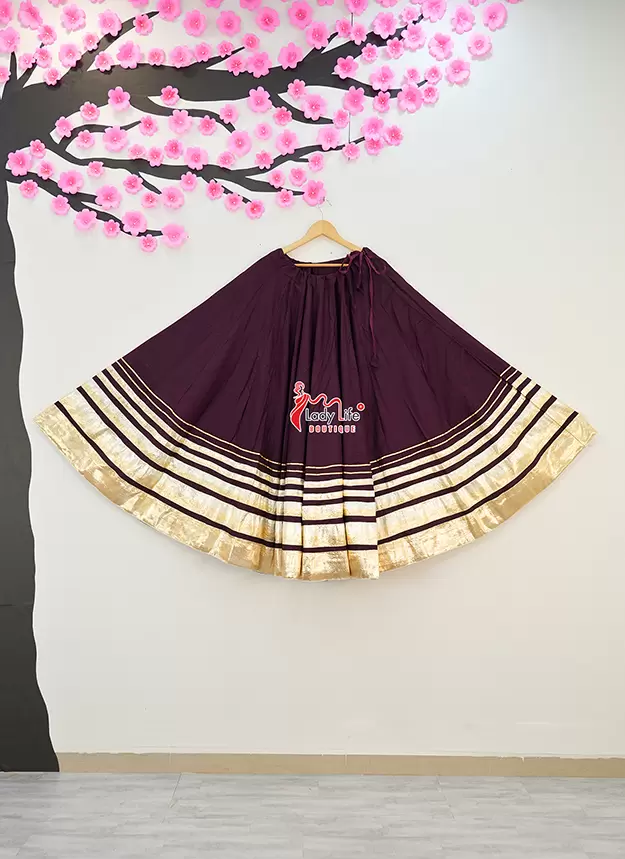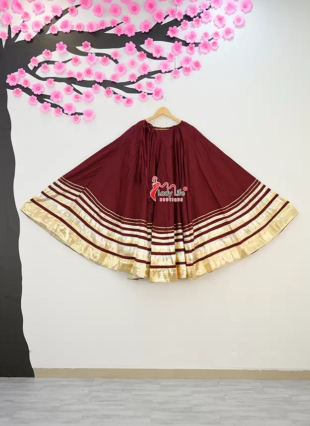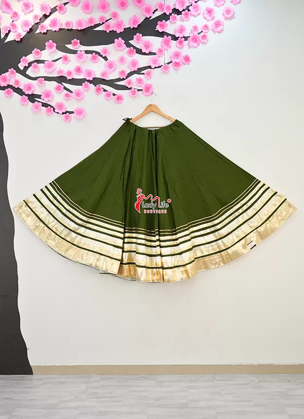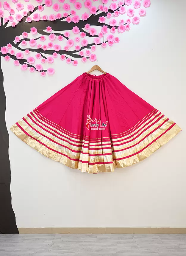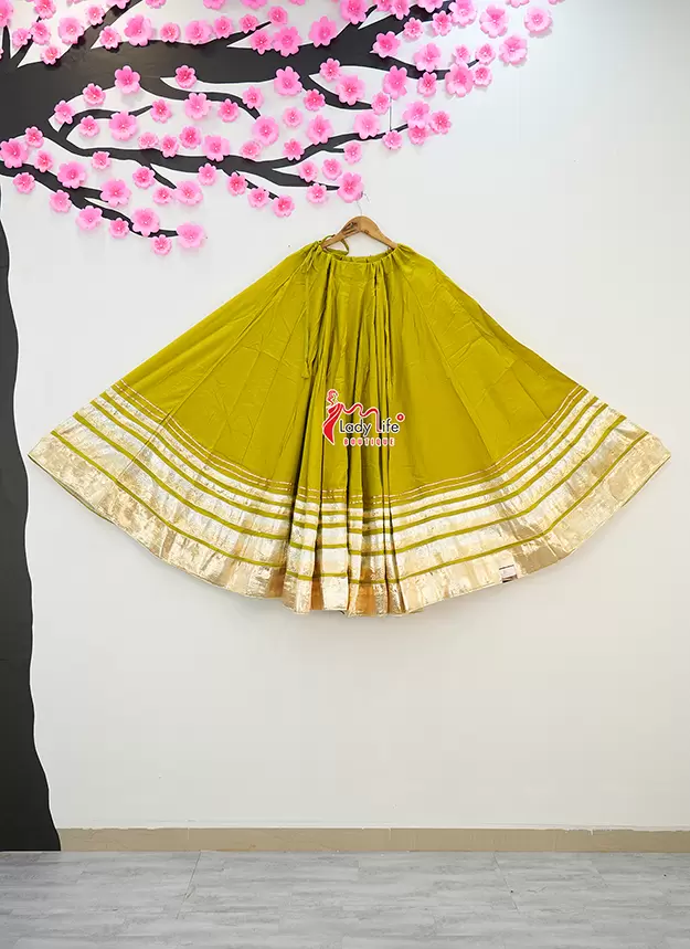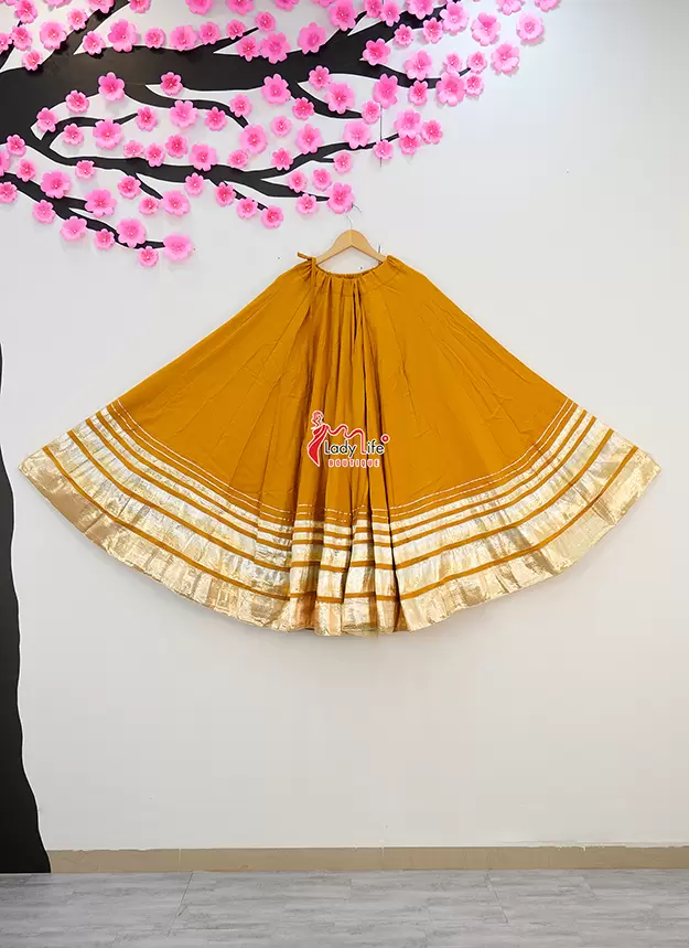 Beautiful Five Lumpy Chaniya crafted from soft Rayon Cotton fabric with a stunning 8 meter heavy flair. Designed with an elegant golden border and available in multiple vibrant colors, perfect for Navratri, Garba, and festive occasions.