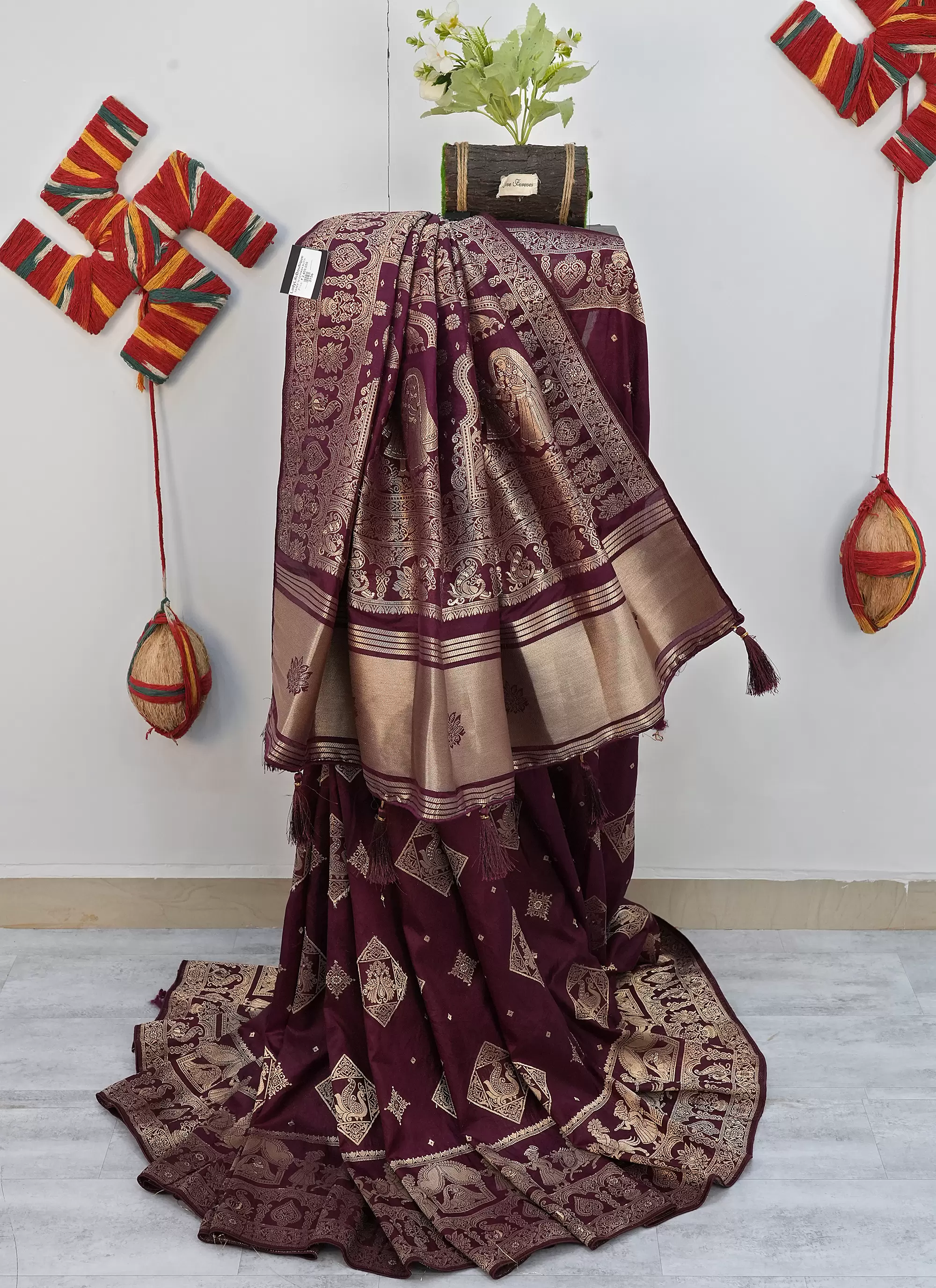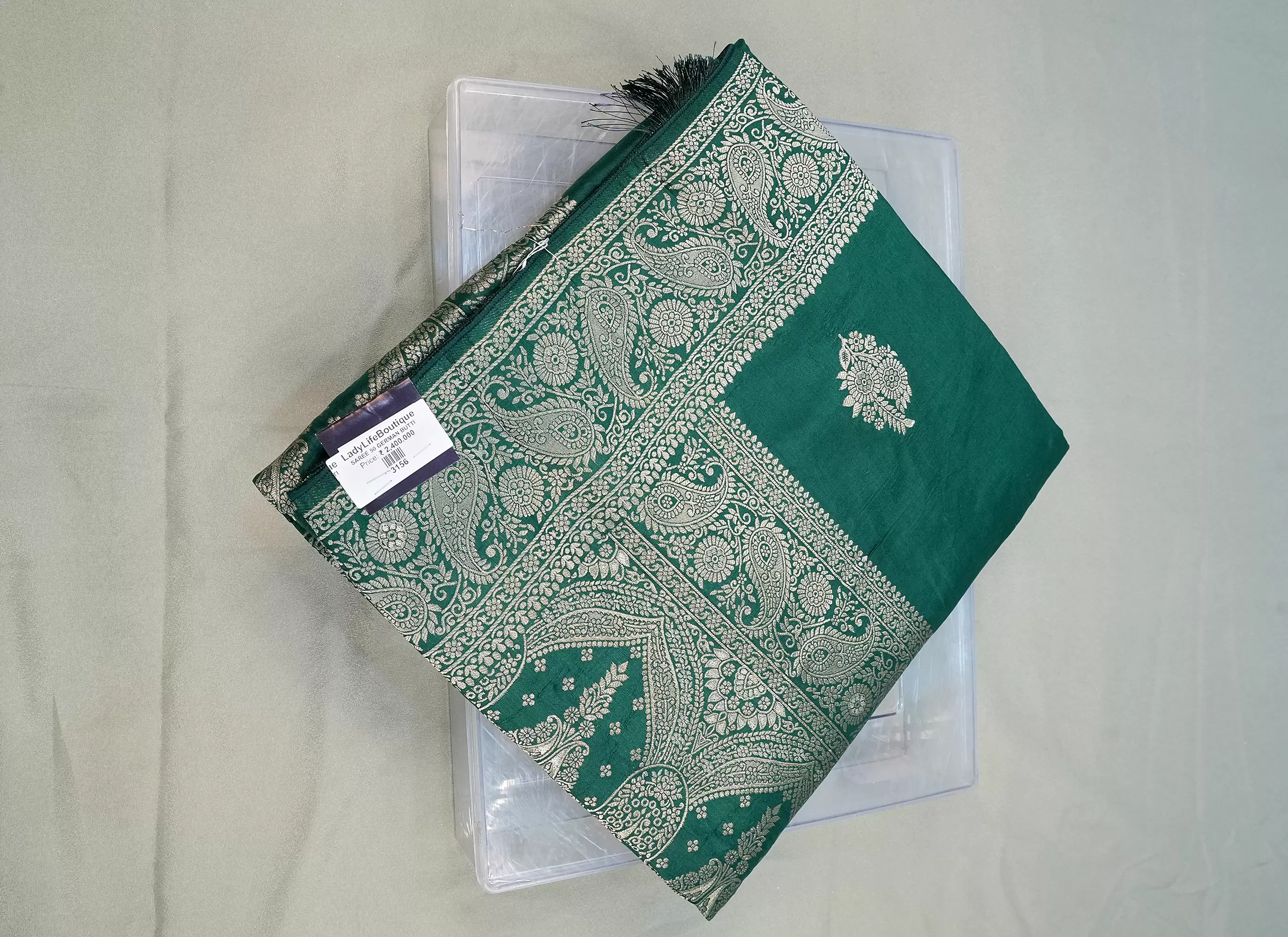 This saree features elegant German Butti design with intricate traditional patterns. The smooth and comfortable fabric gives a rich ethnic look, making it perfect for festive and special occasions. ✨