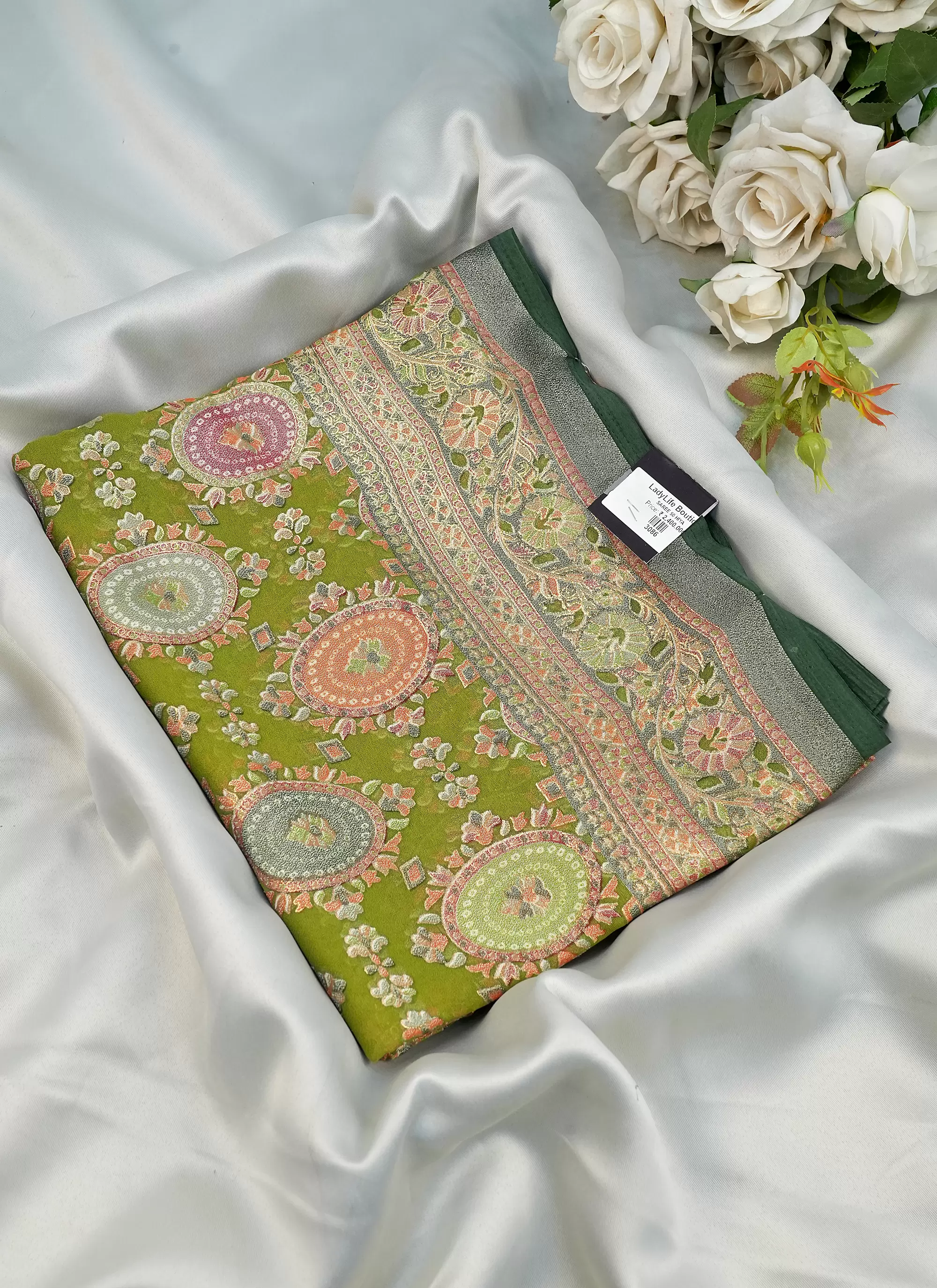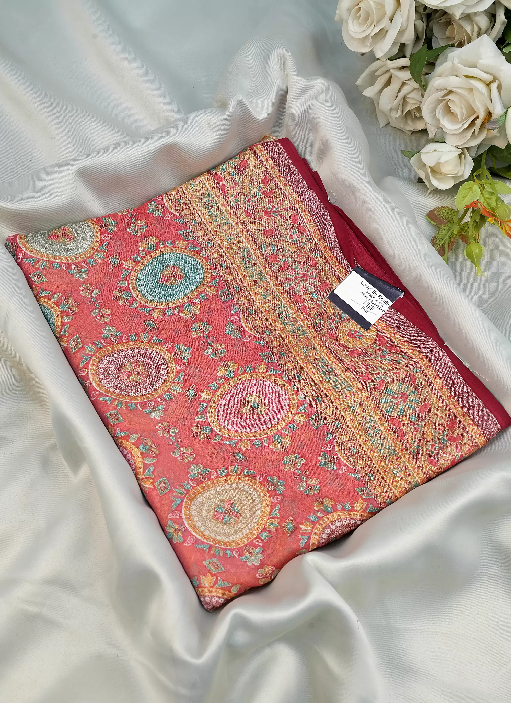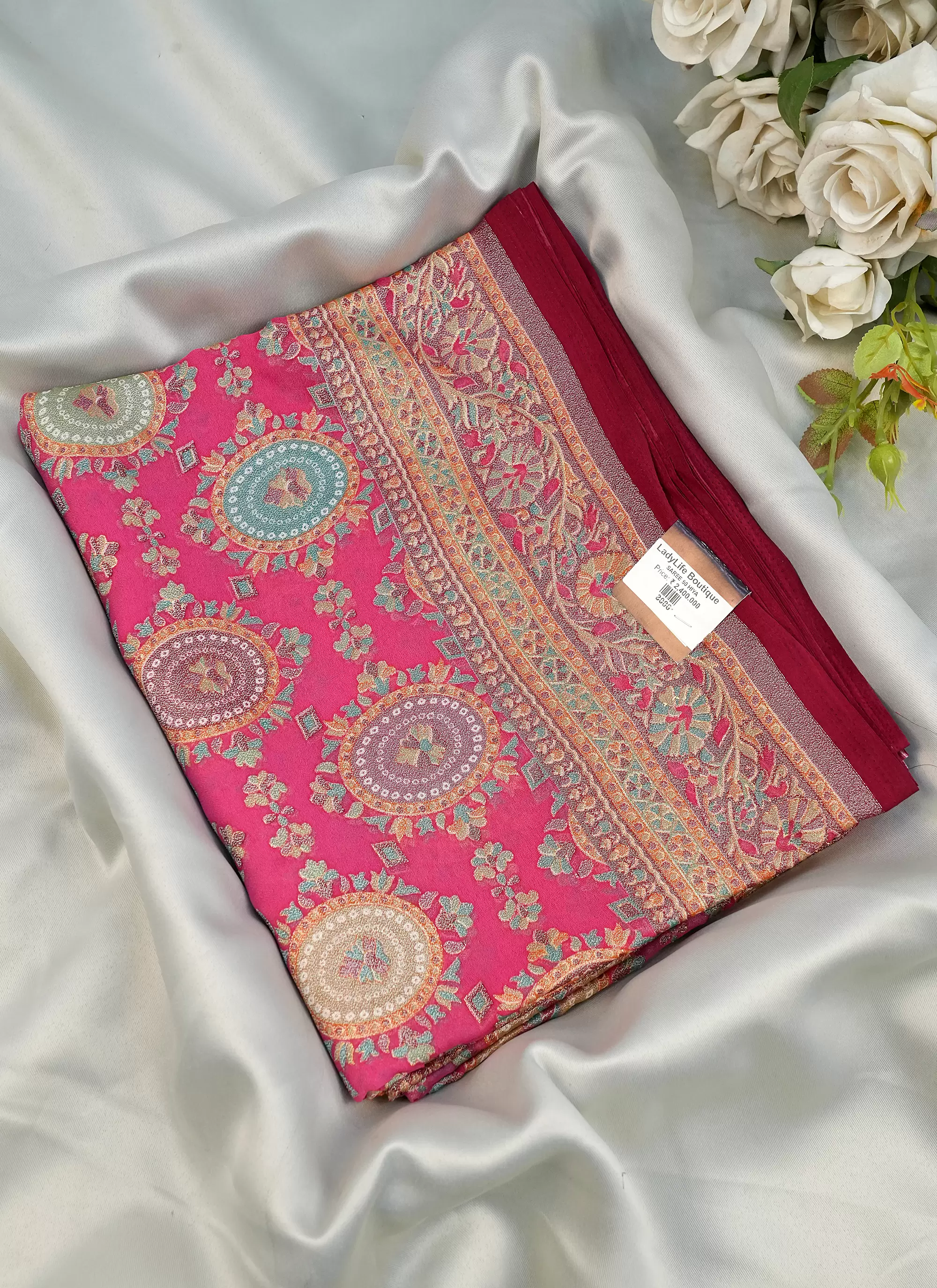 Saree 50 Hiya features a beautiful traditional design with intricate patterns and an elegant woven border, giving it a graceful ethnic look perfect for festive and special occasions. ✨