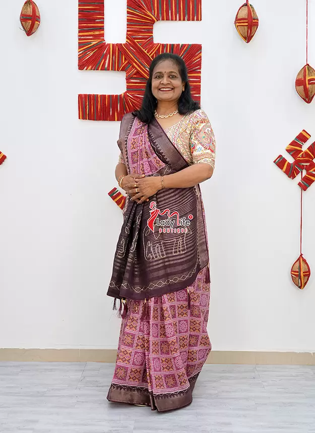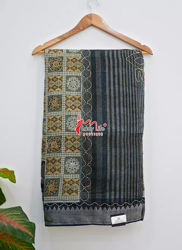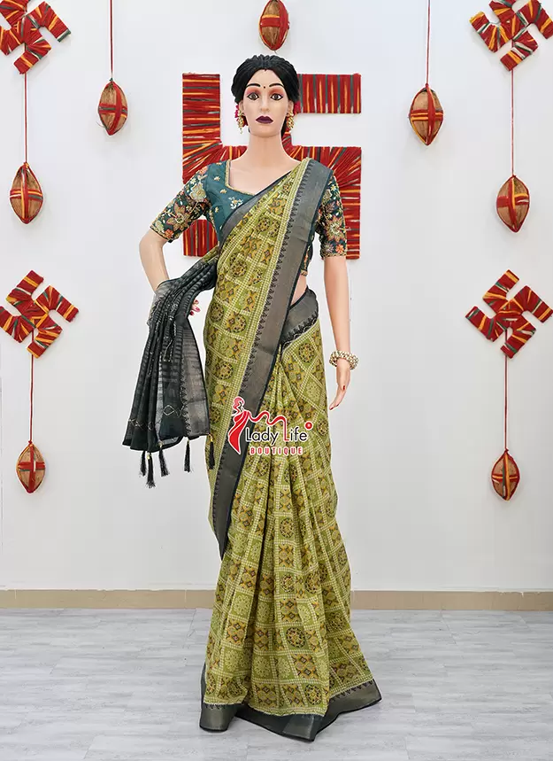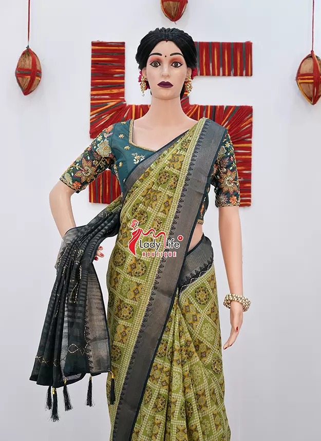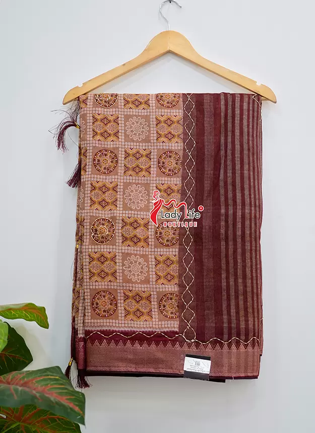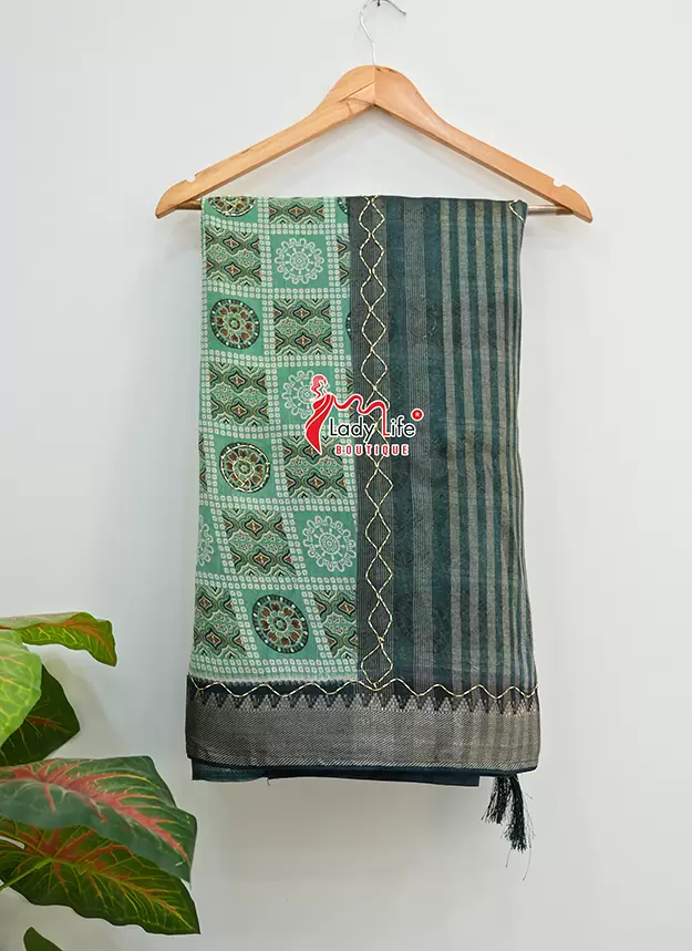 Elegant 50 Janhari saree featuring beautiful traditional prints with a stylish contrast pallu and rich border. The saree showcases classic geometric and floral patterns that give it a graceful ethnic look.
