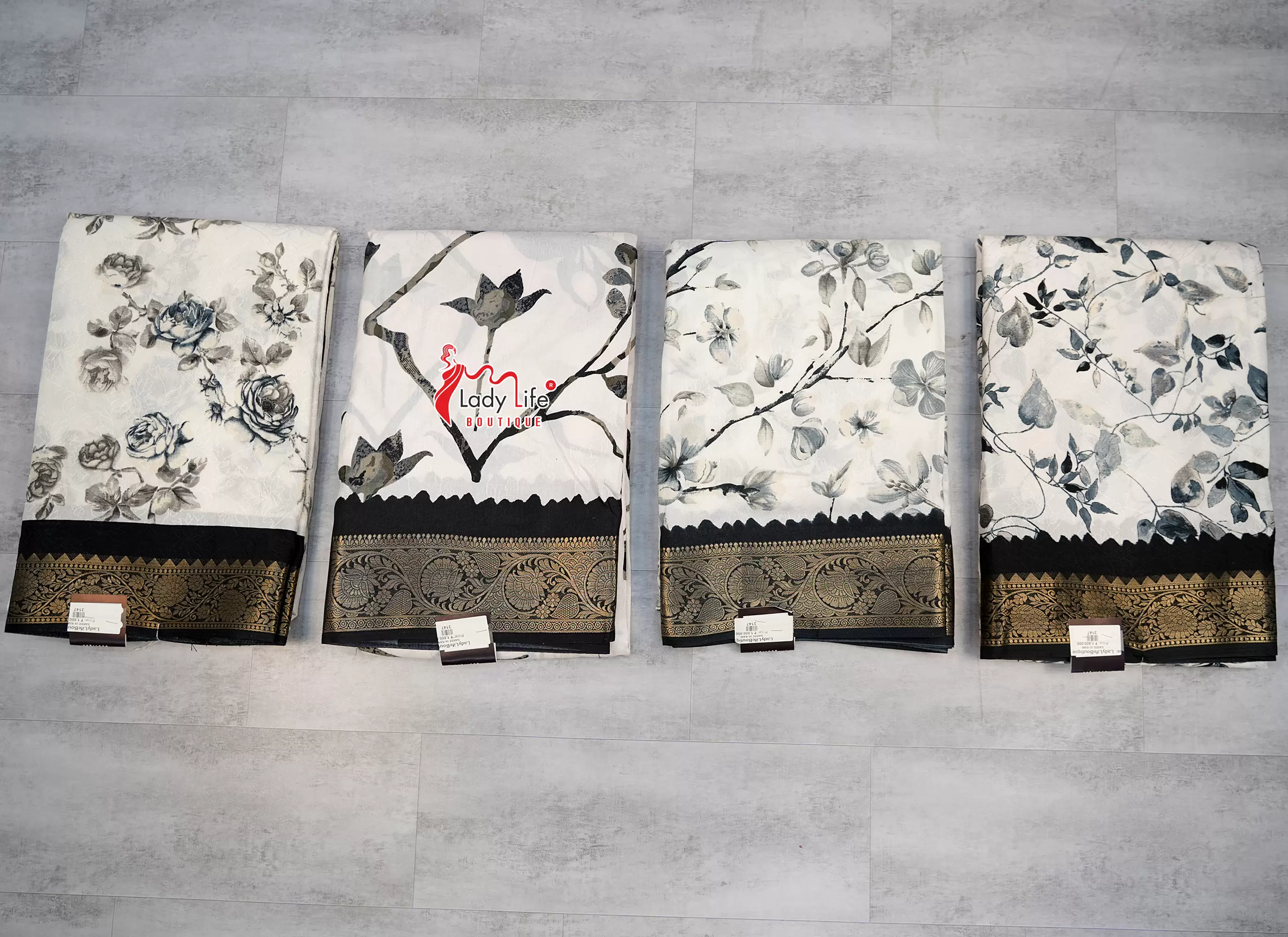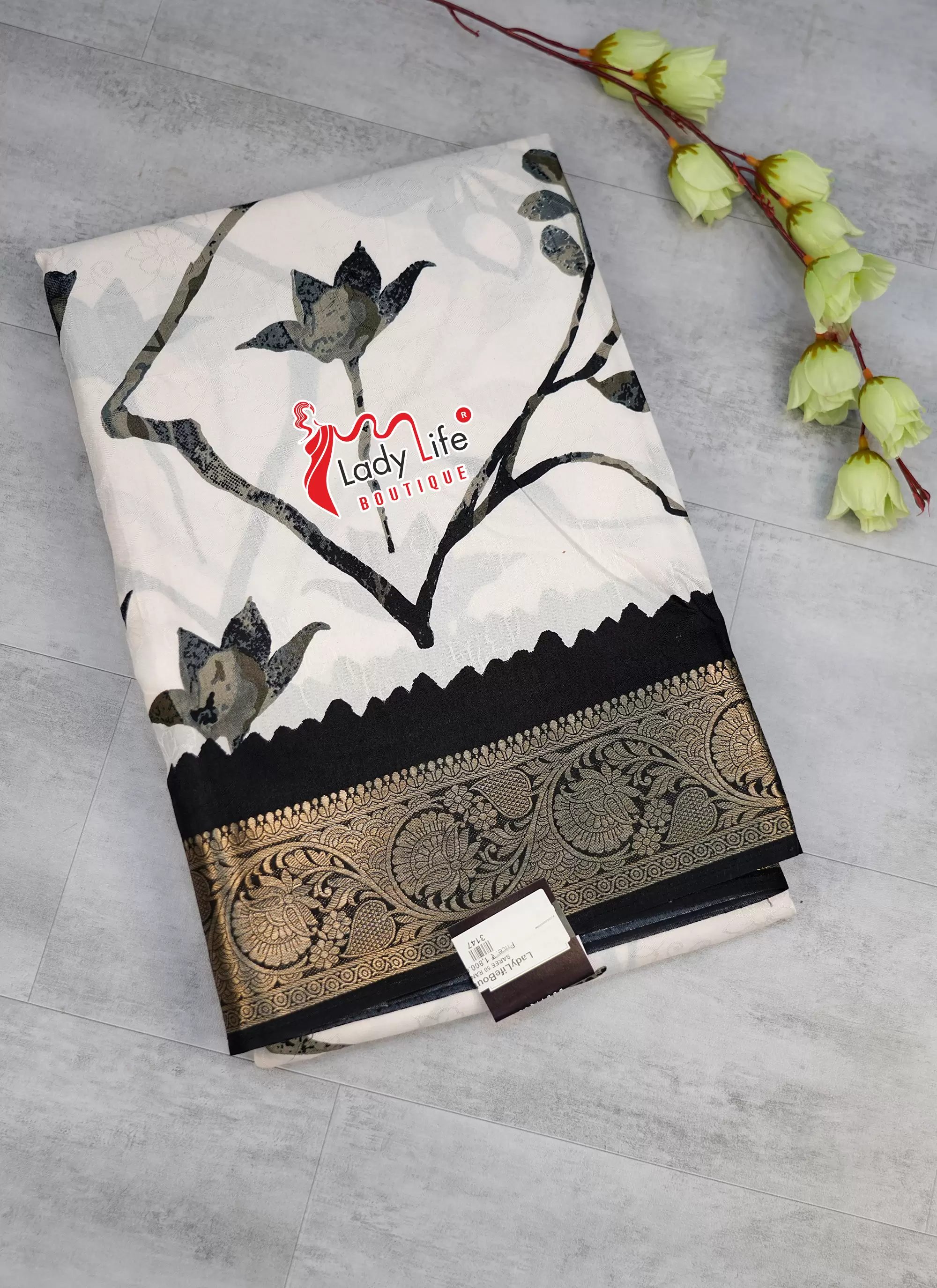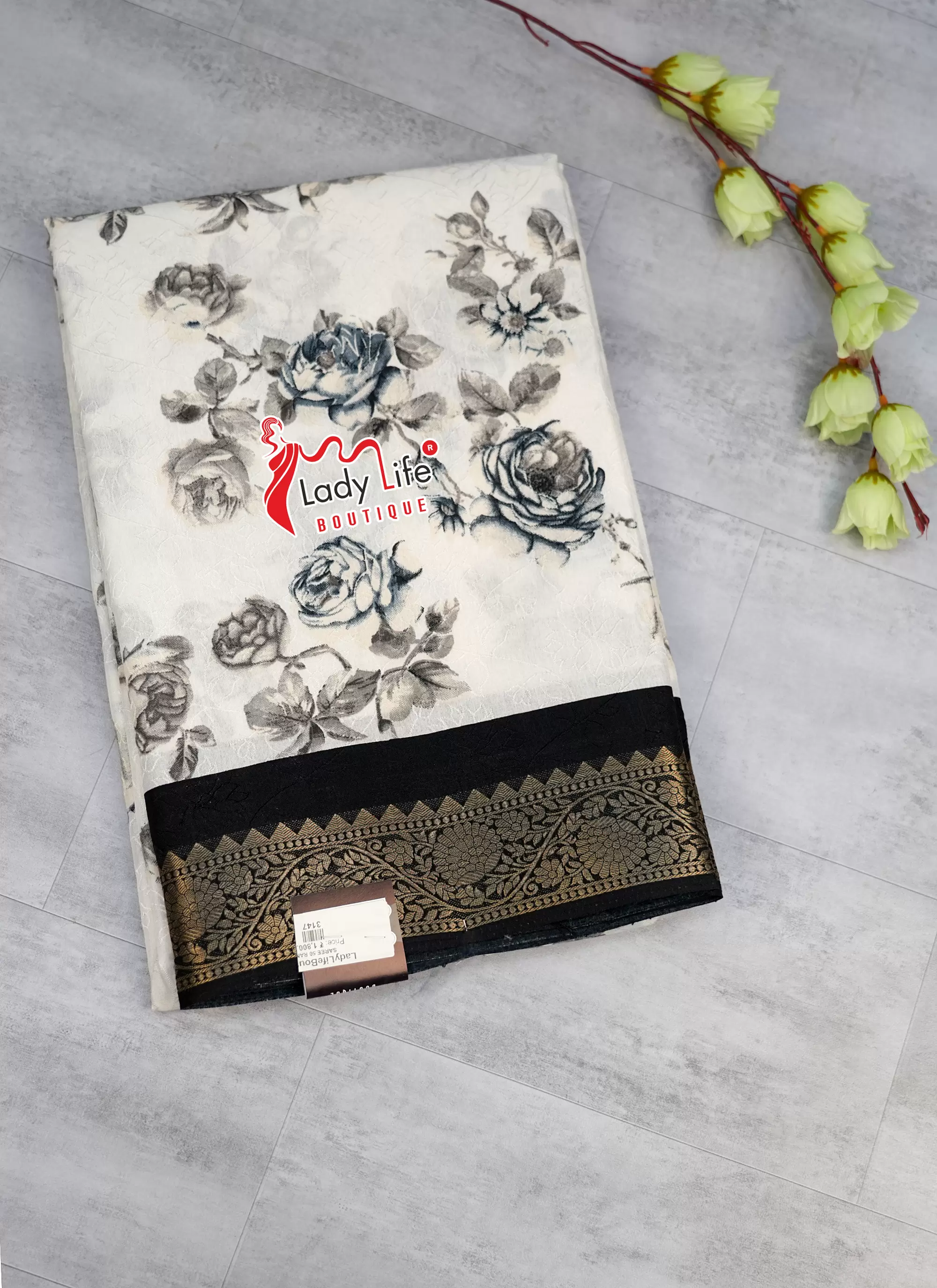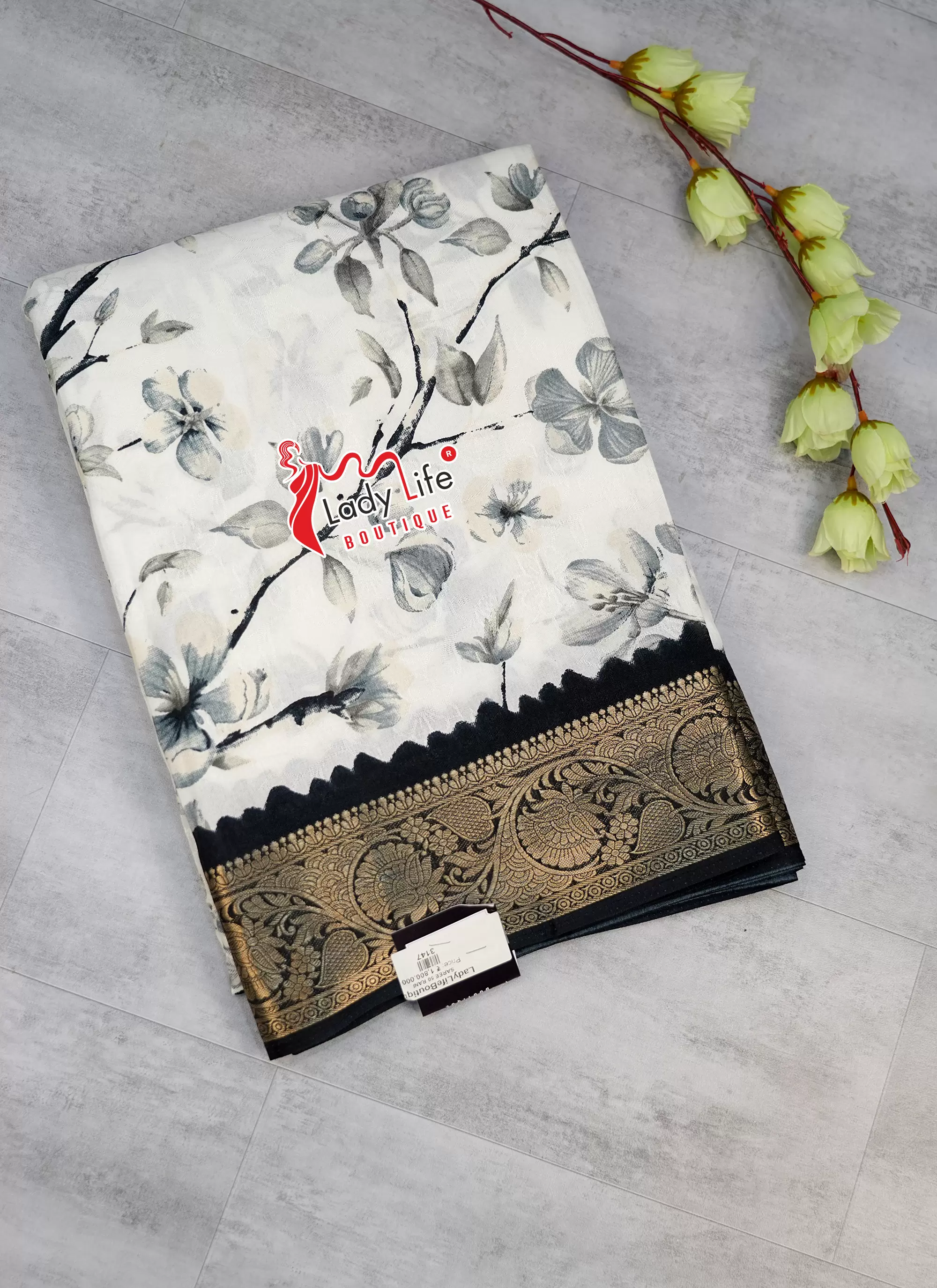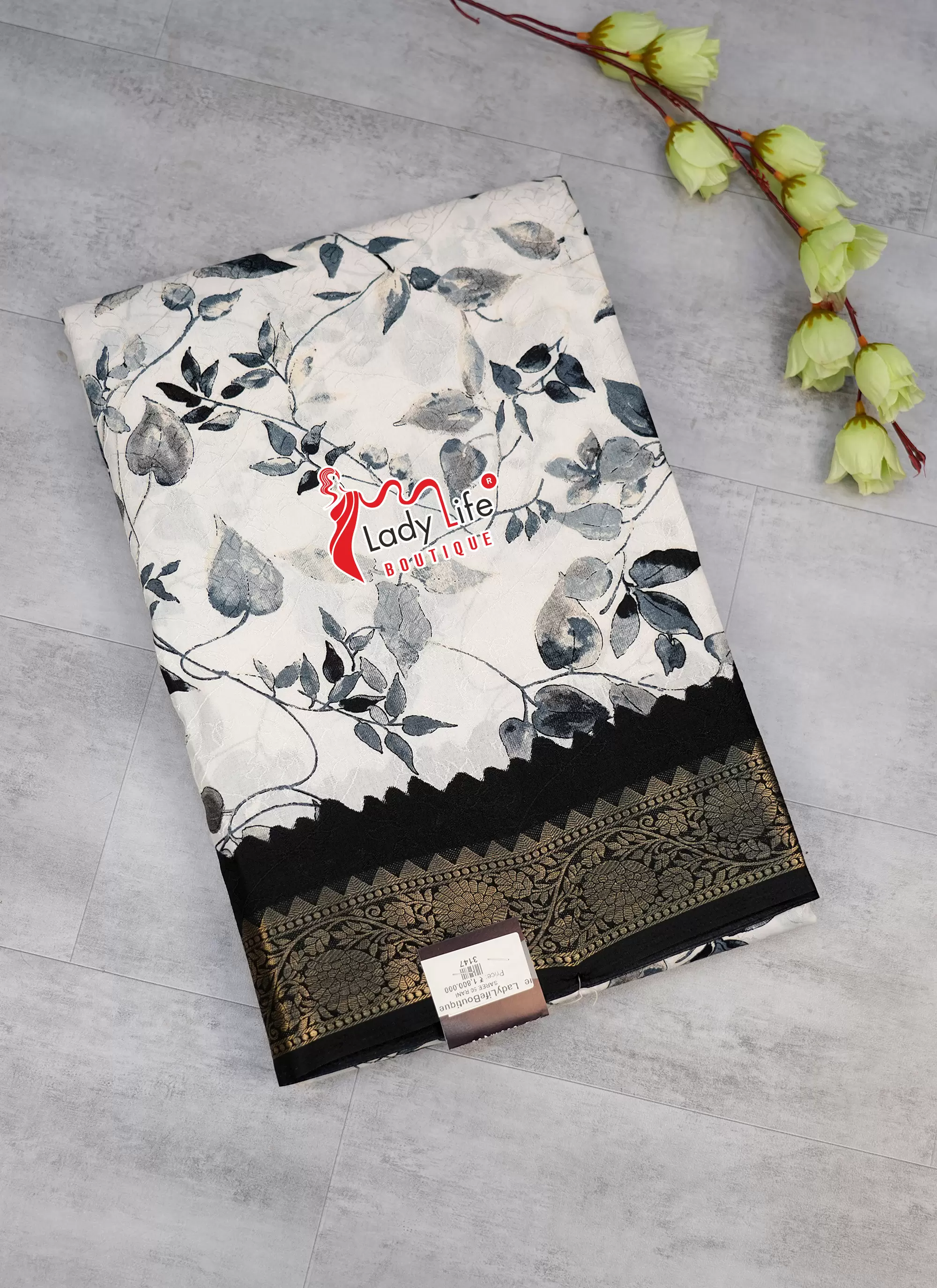 Saree 50 – Rani:Soft floral print saree with elegant black & golden border, perfect for classy everyday and light occasion wear.