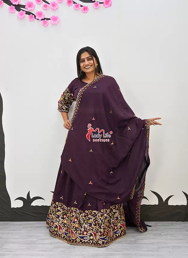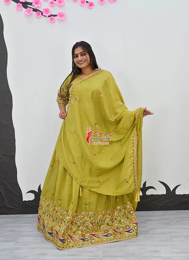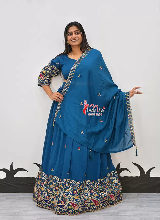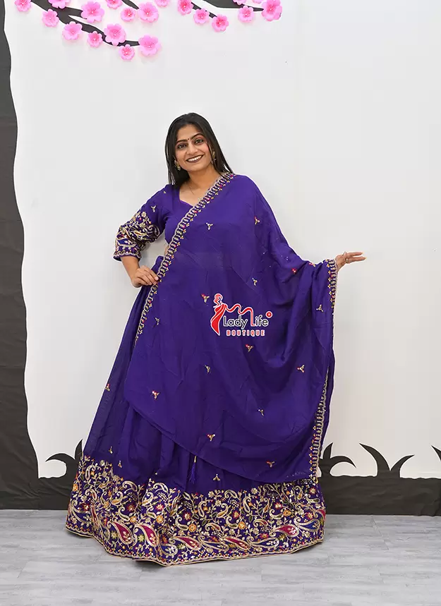 Elegant Vichitra fabric Chaniya Choli with beautiful embroidery, 4-meter flair for a grand look, and available in multiple vibrant colors. Lightweight, comfortable, and perfect for Navratri, weddings, and festive occasions.